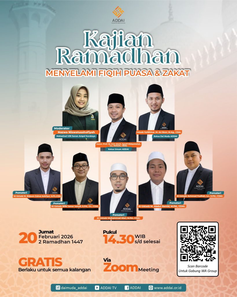 ADDAI Online — Pada hari Jumat, 20 Februari 2026 bertepatan dengan 2 Ramadhan 1447 H, telah dilaksanakan launching Webinar Kajian Ramadhan: Menyelami Fiqih Puasa & Zakat yang diselenggarakan oleh ADDAI (Asosiasi Dai Muda Indonesia). Kegiatan ini dilaksanakan secara daring melalui Zoom Meeting dan terbuka secara gratis untuk seluruh kalangan masyarakat.